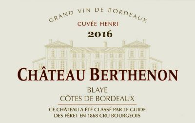 Cuvée Henri, Château Berthenon 2016, a red wine from the right bank with the mention Cru Bourgeois of Blaye Area given in 1968 by the Feret Editions.