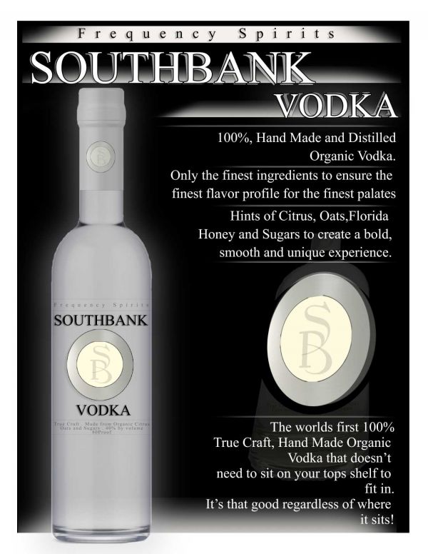 Frequency Spirit's SouthBank Vodka is 100% Hand Made and Distilled Orgnaic Vodka. We use only the finest ingredients to ensure only the finest flavor profile for the finest of palates.There are hints of Citrus,Oats, Florida Honeys and Sugars to create a bold, smooth and unique experience!