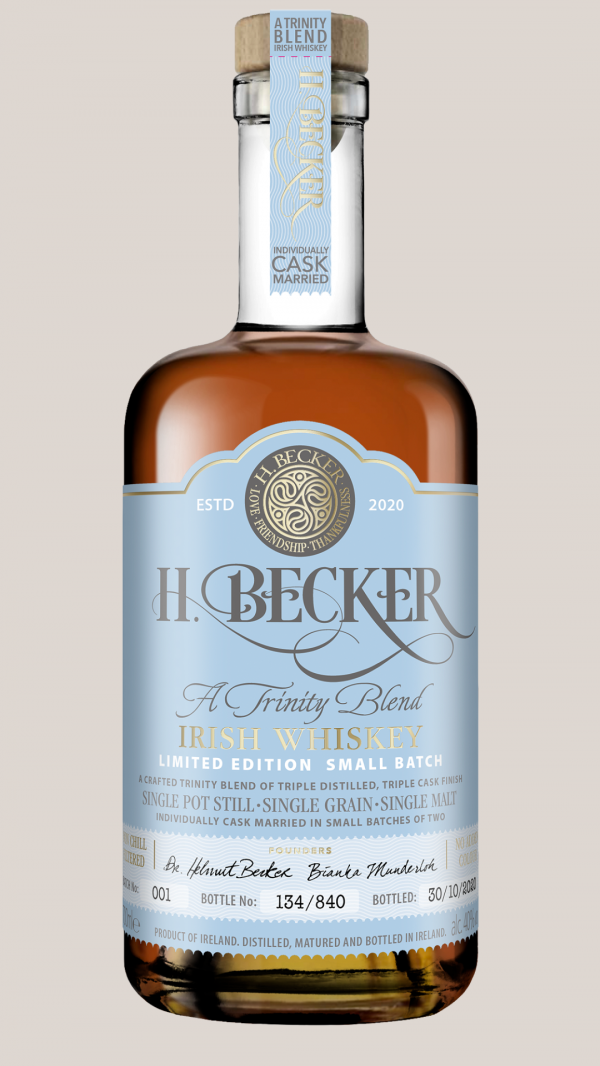 H. Becker Trinity Blend is a joint "Blend in Spirit" of love, friendship and gratitude or in Irish "Grá, Cardieas, Buíocheas", between true whiskey friends from Ireland and Germany. Our Trinity Blend H. Becker Irish Whiskey is a handcrafted Triple Cask Finish "Trinity Blend" of all three types of Irish Whiskey: Single Pot Still in Bourban Cask, Single Grain in Virgin Oak Cask and Single Malt in Sherry Botas. Not chill-filtered and no color added for maximum natural flavor. Triple distilled and individually cask-matured in a limited edition of only two casks per small batch of 840 individually numbered bottles.
