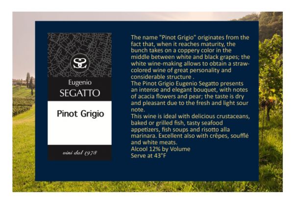 The Pinot Grigio Eugenio Segatto presents an intense and elegant bouquet, with notes of acacia flowers and pear; the taste is dry and pleasant due to the fresh and light sour note.