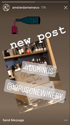 There are many different ways to use Stories. They can be used to promote upcoming events, especially because you can overlay text and graphics on top of the images. They can also be used to announce upcoming sales or discounts. For example, Amsterdam Wine Company, located on Manhattan’s Upper West Side, recently used Instagram Stories to alert customers of the new arrival of Opus One and Dominus wines.