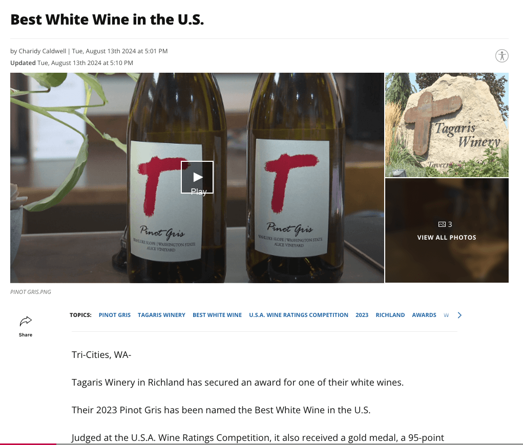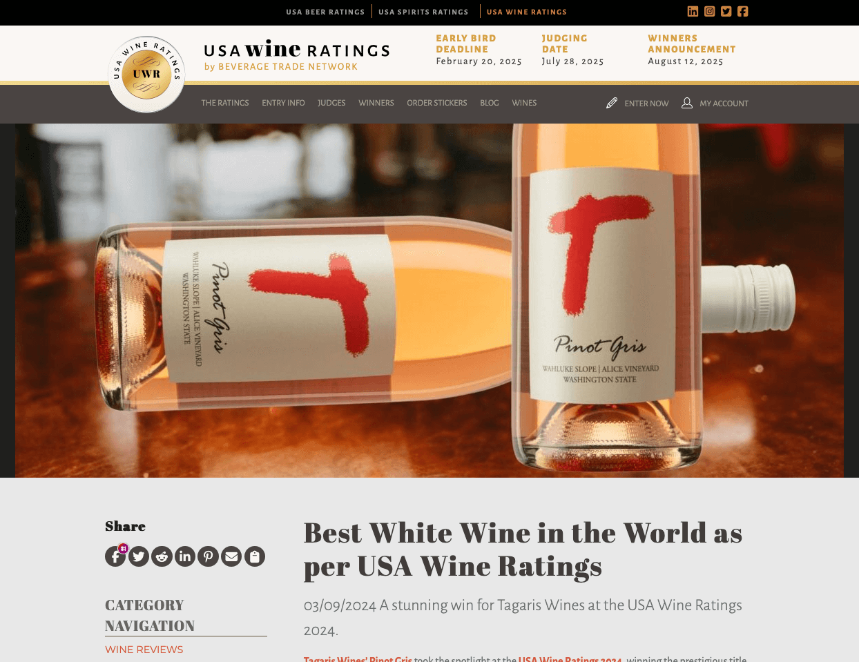 White Wine Of The Year: Tagaris Winery secured White Wine Of The Year. The commercial benefit to win the award will also benefit state distributors as Beverage Trade Network will be marketing the award in its retail community.